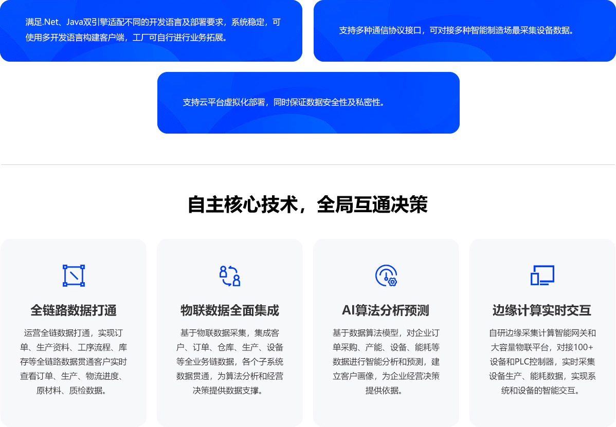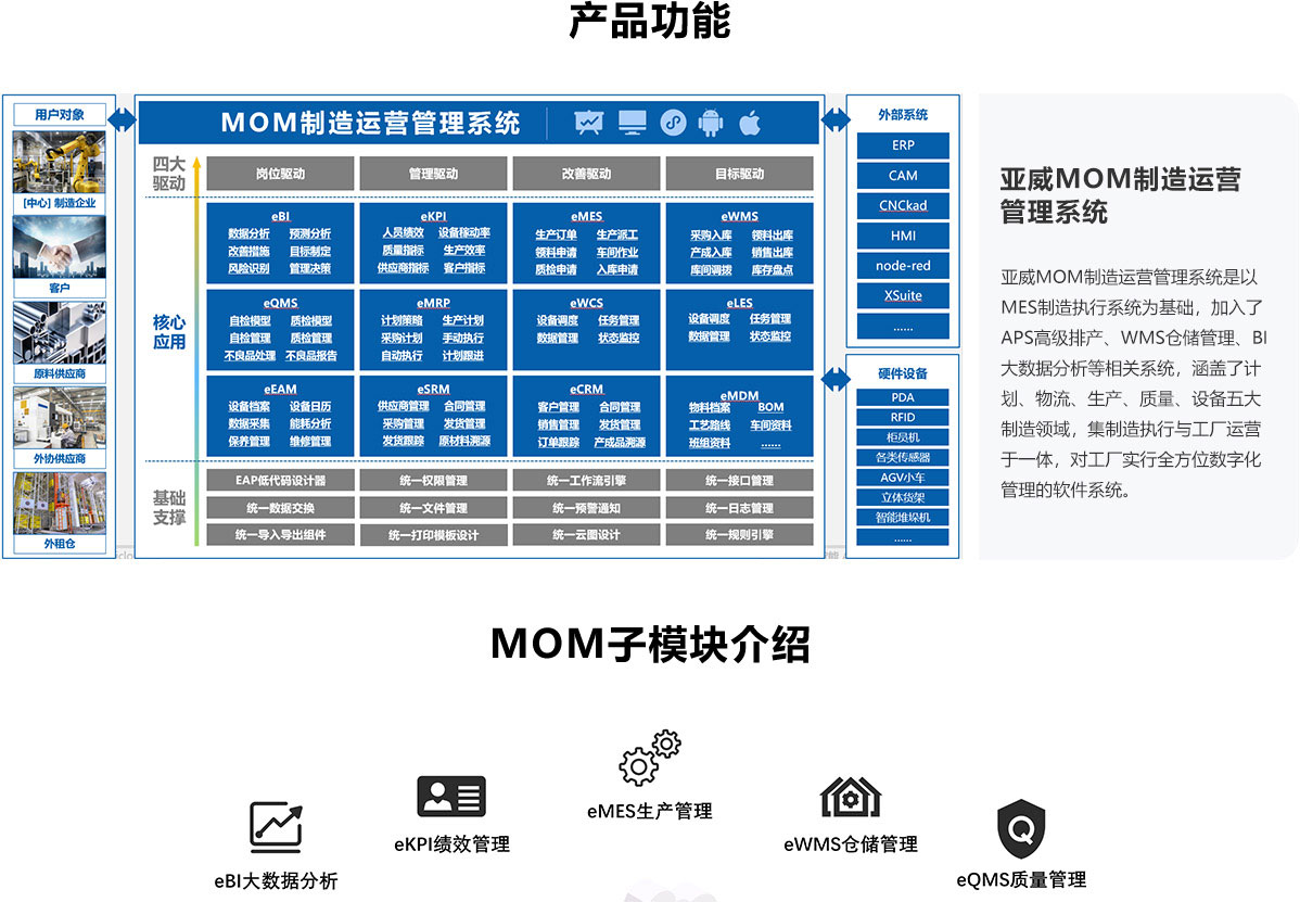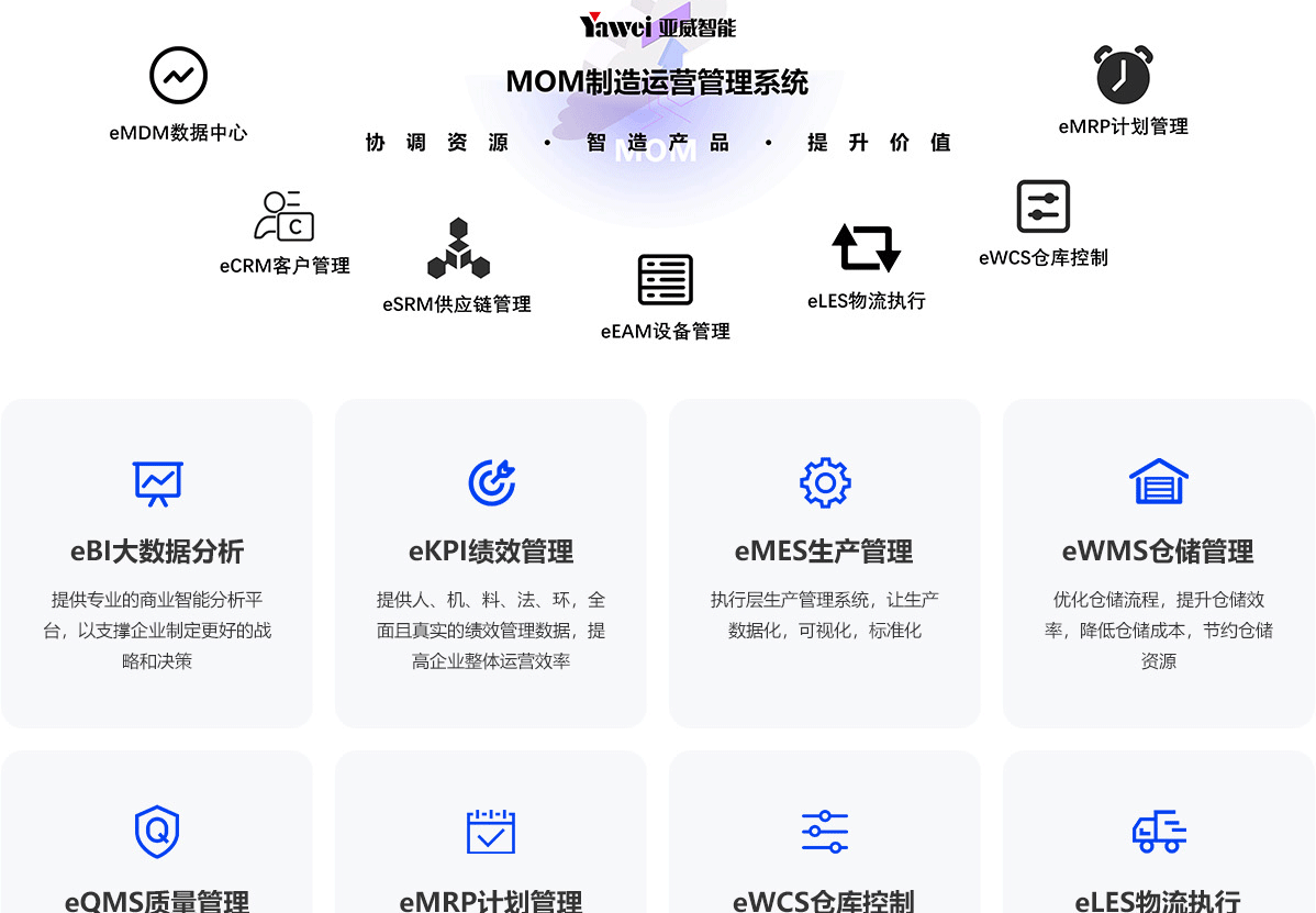 为制造企业客户提供集高级排产APS,制造执行MES,仓储管理WMS,供应链管理SRM,质量管理QMS、物流调度LES等十二项核心模块;